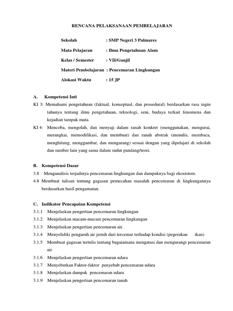 Rpp pencemaran lingkungan smp kelas 7 kurikulum 2013 revisi 2017.